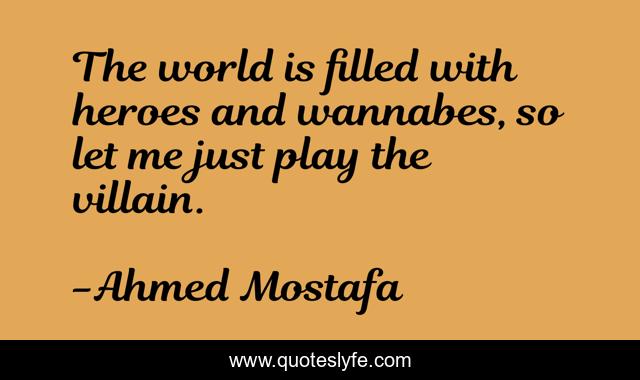 This page presents the quote "The world is filled with heroes and wannabes, so let me just play the villain.". Author of this quote is Ahmed Mostafa. This quote is about wannabes, eccentric, uniqueness, villains-and-heroes, acceptance-of-oneself, villain, villainy, evil,.