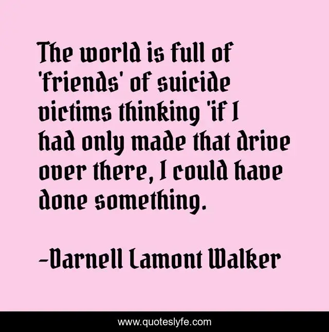 This page presents the quote "The world is full of 'friends' of suicide victims thinking 'if I had only made that drive over there, I could have done something.". Author of this quote is Darnell Lamont Walker. This quote is about suicide, friends, save-a-life,.