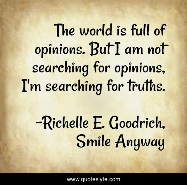 This page presents the quote "The world is full of opinions. But I am not searching for opinions, I'm searching for truths.". Author of this quote is Richelle E. Goodrich, Smile Anyway. This quote is about opinions, viewpoint, answers, reality, behaviour, attitude, richelle, truth, richelle-goodrich,.