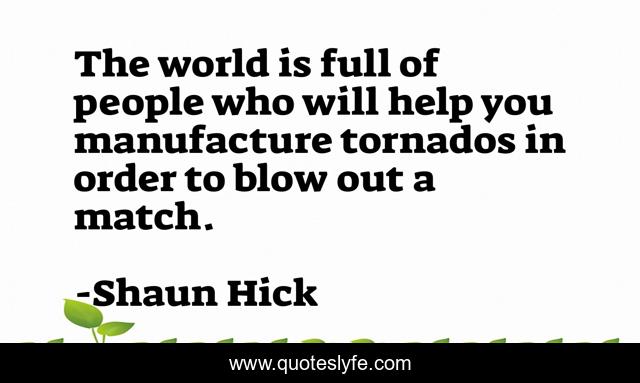 This page presents the quote "The world is full of people who will help you manufacture tornados in order to blow out a match.". Author of this quote is Shaun Hick. This quote is about simplicity, simple-solution, needless, simple, hard, overkill, logical, tornado, overthinking,.