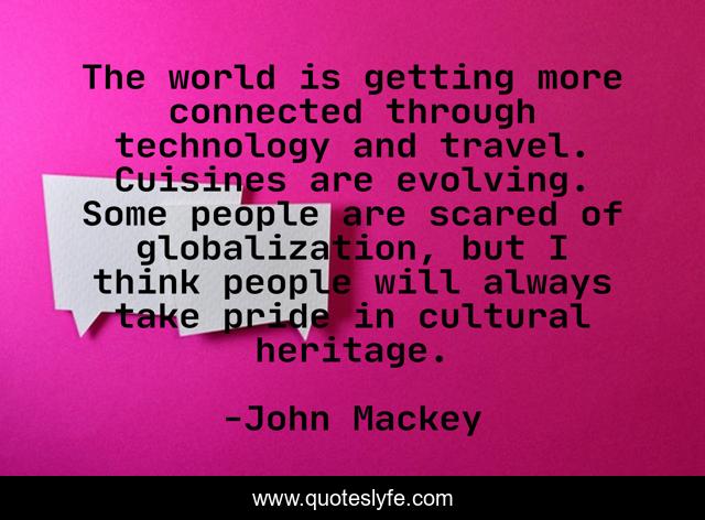 This page presents the quote "The world is getting more connected through technology and travel. Cuisines are evolving. Some people are scared of globalization, but I think people will always take pride in cultural heritage.". Author of this quote is John Mackey. This quote is about world, pride, technology,.