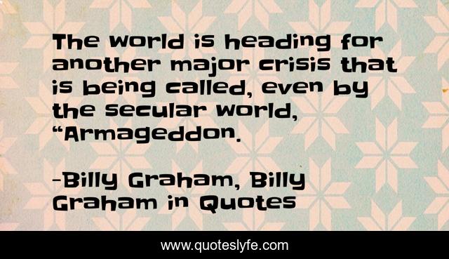 This page presents the quote "The world is heading for another major crisis that is being called, even by the secular world, “Armageddon.". Author of this quote is Billy Graham, Billy Graham in Quotes. This quote is about armageddon, end-times, billy-graham,.