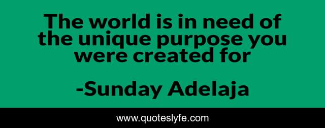 This page presents the quote "The world is in need of the unique purpose you were created for". Author of this quote is Sunday Adelaja. This quote is about god, mandate, creation, purpose, world,.
