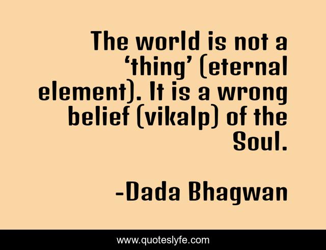 This page presents the quote "The world is not a ‘thing’ (eternal element). It is a wrong belief (vikalp) of the Soul.". Author of this quote is Dada Bhagwan. This quote is about spiritual, elements, vikalp, self, soul, world, belief,.