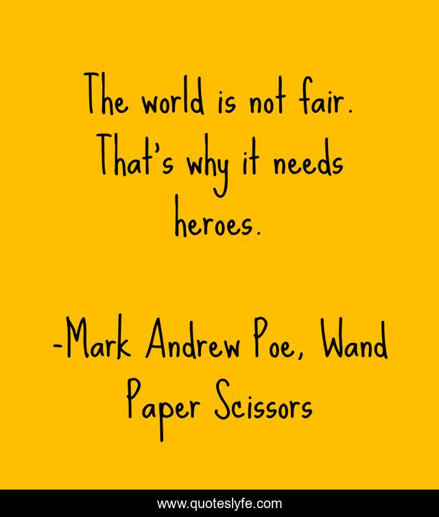 This page presents the quote "The world is not fair. That's why it needs heroes.". Author of this quote is Mark Andrew Poe, Wand Paper Scissors. This quote is about activism-inspiration, heroes, fair, inspiration,.