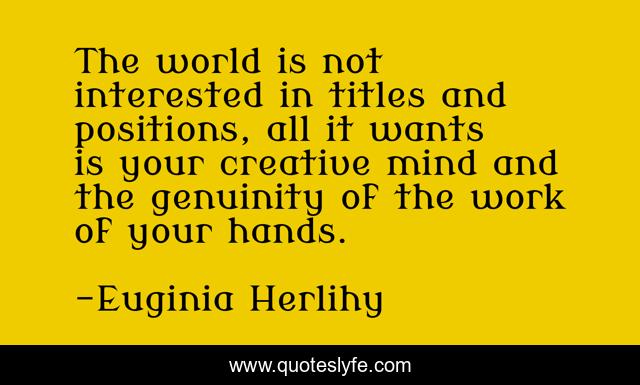 This page presents the quote "The world is not interested in titles and positions, all it wants is your creative mind and the genuinity of the work of your hands.". Author of this quote is Euginia Herlihy. .