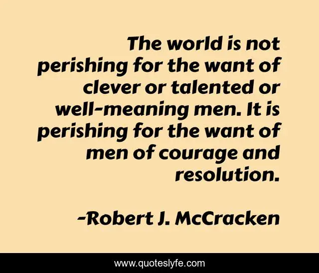 This page presents the quote "The world is not perishing for the want of clever or talented or well-meaning men. It is perishing for the want of men of courage and resolution.". Author of this quote is Robert J. McCracken. .