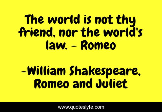 This page presents the quote "The world is not thy friend, nor the world's law. - Romeo". Author of this quote is William Shakespeare, Romeo and Juliet. This quote is about romeo-and-juliet, law, shakespeare, government,.