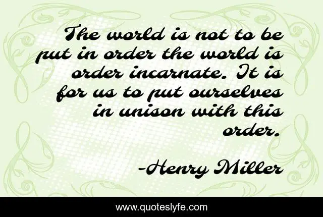 This page presents the quote "The world is not to be put in order the world is order incarnate. It is for us to put ourselves in unison with this order.". Author of this quote is Henry Miller. .
