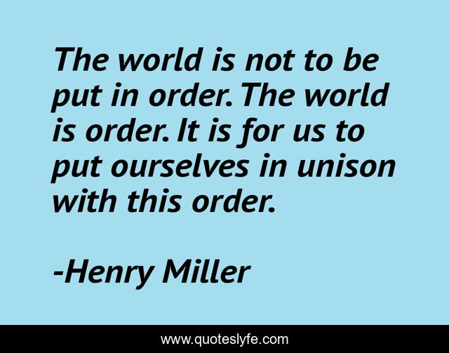 This page presents the quote "The world is not to be put in order. The world is order. It is for us to put ourselves in unison with this order.". Author of this quote is Henry Miller. This quote is about world, life, order, nature,.