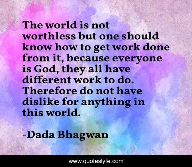 This page presents the quote "The world is not worthless but one should know how to get work done from it, because everyone is God, they all have different work to do. Therefore do not have dislike for anything in this world.". Author of this quote is Dada Bhagwan. This quote is about god, dislike, like, spiritual, world,.