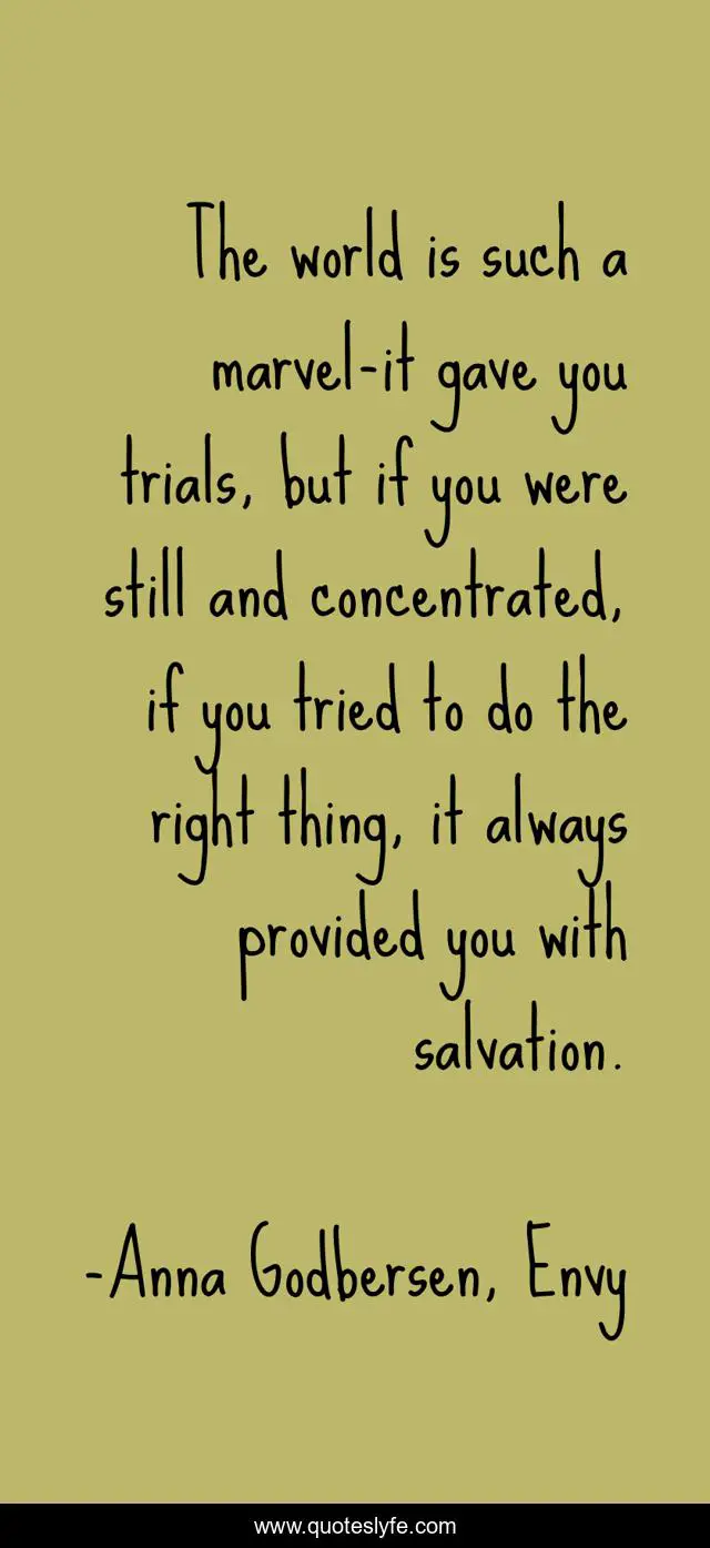 This page presents the quote "The world is such a marvel-it gave you trials, but if you were still and concentrated, if you tried to do the right thing, it always provided you with salvation.". Author of this quote is Anna Godbersen, Envy. This quote is about world, salvation, right-thing,.