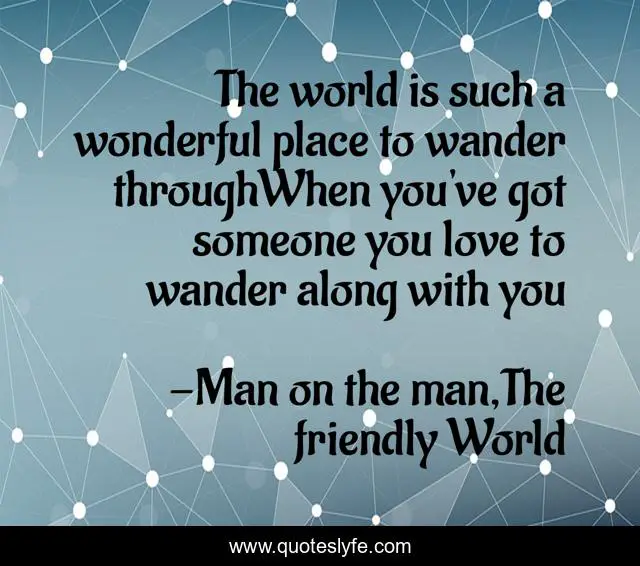 This page presents the quote "The world is such a wonderful place to wander throughWhen you've got someone you love to wander along with you". Author of this quote is Man on the man,The friendly World. This quote is about love, affection, wonder,.