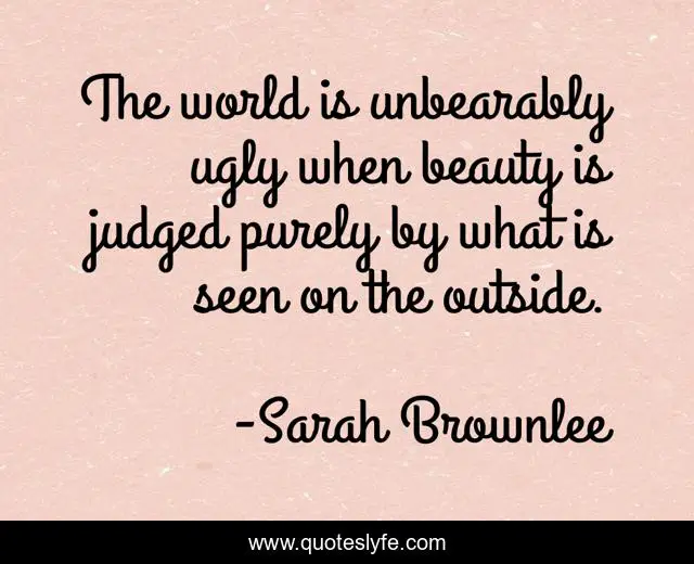 This page presents the quote "The world is unbearably ugly when beauty is judged purely by what is seen on the outside.". Author of this quote is Sarah Brownlee. This quote is about beauty-in-nature, ugly, shallow, beauty, philosophy,.