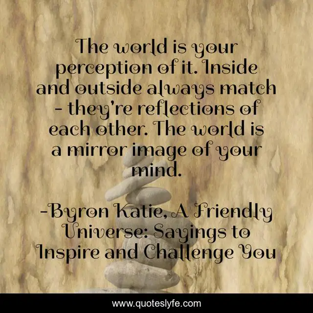 This page presents the quote "The world is your perception of it. Inside and outside always match - they're reflections of each other. The world is a mirror image of your mind.". Author of this quote is Byron Katie, A Friendly Universe: Sayings to Inspire and Challenge You. This quote is about enthusiasm, psychology, inspirational, self-help,.