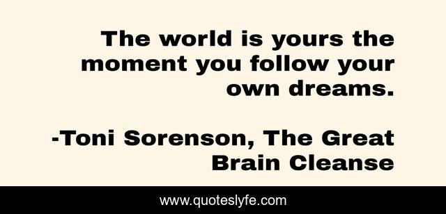 This page presents the quote "The world is yours the moment you follow your own dreams.". Author of this quote is Toni Sorenson, The Great Brain Cleanse. This quote is about life, love, success, health, affection, fitness, world, happiness, dreams,.