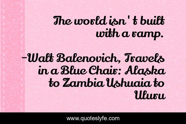 This page presents the quote "The world isn't built with a ramp.". Author of this quote is Walt Balenovich, Travels in a Blue Chair: Alaska to Zambia Ushuaia to Uluru. This quote is about travel, disability, backpacking,.