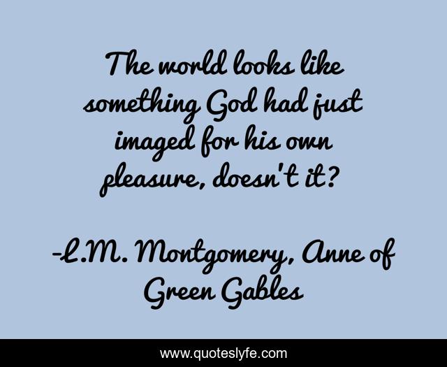 This page presents the quote "The world looks like something God had just imaged for his own pleasure, doesn't it?". Author of this quote is L.M. Montgomery, Anne of Green Gables. This quote is about anne-of-green-gables, god, pleasure,.