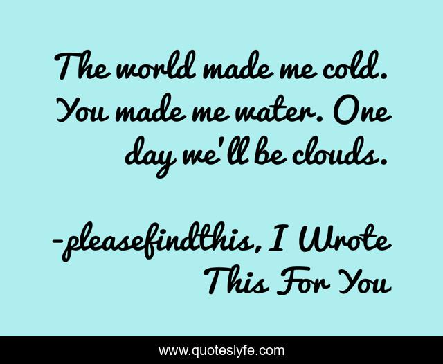 This page presents the quote "The world made me cold. You made me water. One day we'll be clouds.". Author of this quote is pleasefindthis, I Wrote This For You. This quote is about clouds, love, water, world, cold, affection,.