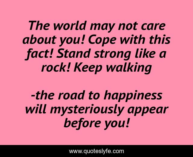 This page presents the quote "The world may not care about you! Cope with this fact! Stand strong like a rock! Keep walking". Author of this quote is the road to happiness will mysteriously appear before you!. .