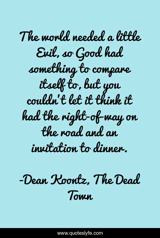 This page presents the quote "The world needed a little Evil, so Good had something to compare itself to, but you couldn't let it think it had the right-of-way on the road and an invitation to dinner.". Author of this quote is Dean Koontz, The Dead Town. This quote is about balance, good, evil,.