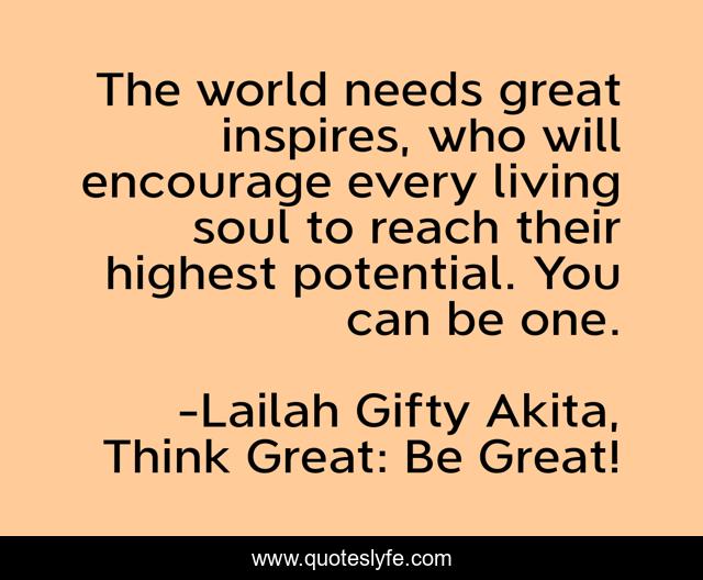 "Lailah Gifty Akita, Think Great: Be Great! Quotes." Quoteslyfe.com, 2026. Wed. 14 Jan. 2026. <https://www.quoteslyfe.com/quote/The-world-needs-great-inspires-who-will-79613>.