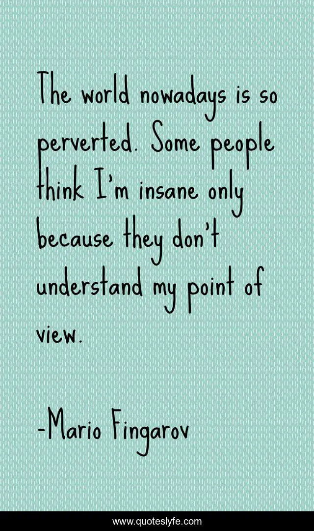 This page presents the quote "The world nowadays is so perverted. Some people think I'm insane only because they don't understand my point of view.". Author of this quote is Mario Fingarov. This quote is about pervert, misbelief, reality,.