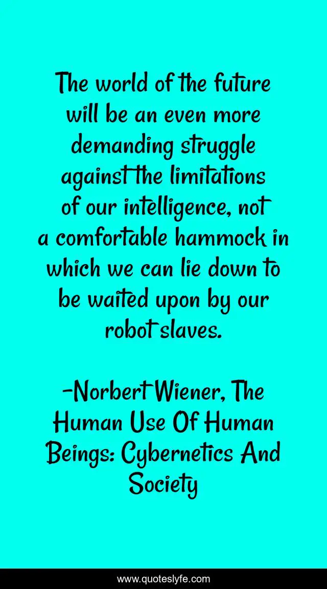 This page presents the quote "The world of the future will be an even more demanding struggle against the limitations of our intelligence, not a comfortable hammock in which we can lie down to be waited upon by our robot slaves.". Author of this quote is Norbert Wiener, The Human Use Of Human Beings: Cybernetics And Society. This quote is about intelligence, cybernetics, robots,.