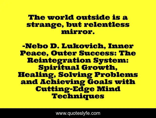 This page presents the quote "The world outside is a strange, but relentless mirror.". Author of this quote is Nebo D. Lukovich, Inner Peace, Outer Success: The Reintegration System: Spiritual Growth, Healing, Solving Problems and Achieving Goals with Cutting-Edge Mind Techniques. This quote is about spirituality, metaphysics,.