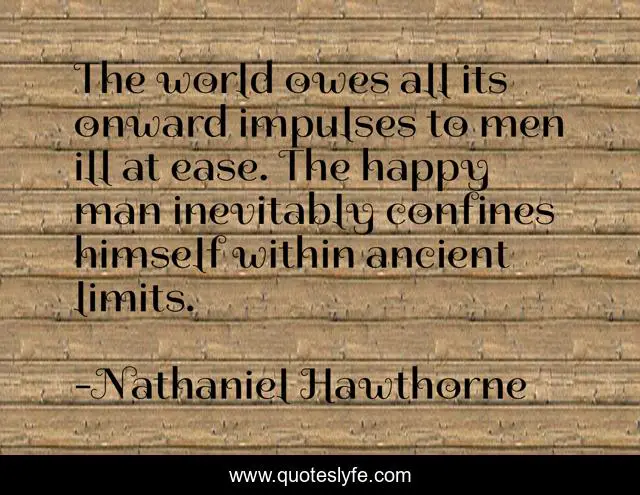 This page presents the quote "The world owes all its onward impulses to men ill at ease. The happy man inevitably confines himself within ancient limits.". Author of this quote is Nathaniel Hawthorne. .