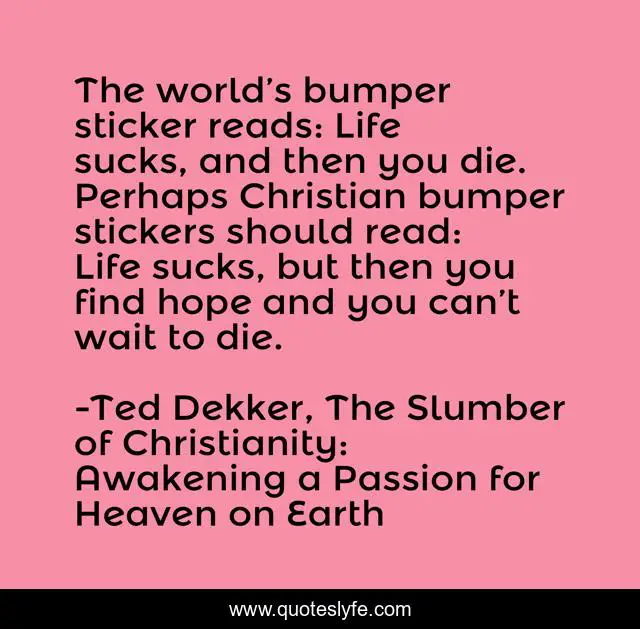 This page presents the quote "The world’s bumper sticker reads: Life sucks, and then you die. Perhaps Christian bumper stickers should read: Life sucks, but then you find hope and you can’t wait to die.". Author of this quote is Ted Dekker, The Slumber of Christianity: Awakening a Passion for Heaven on Earth. This quote is about bumper-sticker, pessimism, christianity, positive-thinking,.