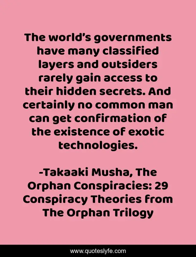 "Takaaki Musha, The Orphan Conspiracies: 29 Conspiracy Theories from The Orphan Trilogy Quotes." Quoteslyfe.com, 2025. Fri. 05 Dec. 2025. <https://www.quoteslyfe.com/quote/The-world-s-governments-have-many-classified-196685>.