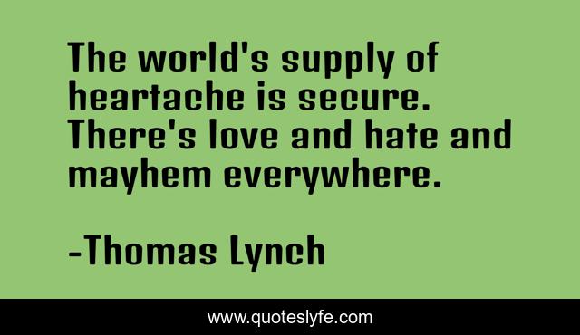 This page presents the quote "The world's supply of heartache is secure. There's love and hate and mayhem everywhere.". Author of this quote is Thomas Lynch. This quote is about heartache, life, poetry,.