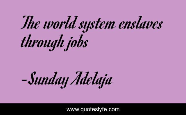 This page presents the quote "The world system enslaves through jobs". Author of this quote is Sunday Adelaja. This quote is about life, blessing, jobless, money, work, slavery, finance, system, job,.