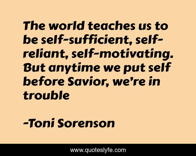 This page presents the quote "The world teaches us to be self-sufficient, self-reliant, self-motivating. But anytime we put self before Savior, we’re in trouble". Author of this quote is Toni Sorenson. This quote is about god, life, addiction-and-recovery, christ, jesus,.