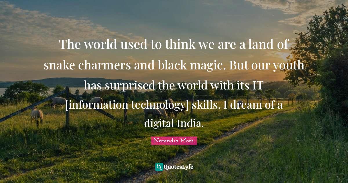 This page presents the quote "The world used to think we are a land of snake charmers and black magic. But our youth has surprised the world with its IT [information technology] skills. I dream of a digital India.". Author of this quote is Narendra Modi. This quote is about dream, used, black, magic, digital india, information technology, youth, world, thinking,.