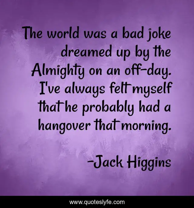This page presents the quote "The world was a bad joke dreamed up by the Almighty on an off-day. I've always felt myself that he probably had a hangover that morning.". Author of this quote is Jack Higgins. This quote is about joke, hangover, almighty, bad, world, dream,.