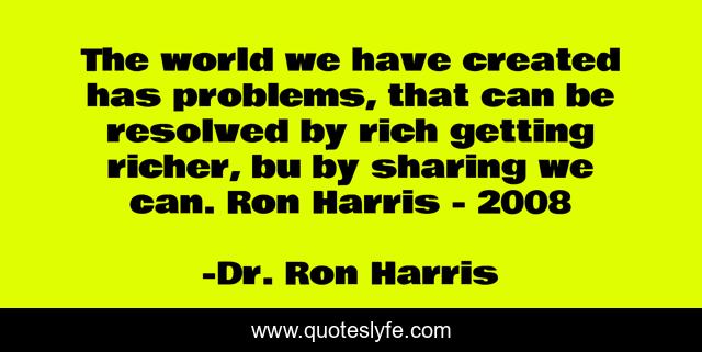 This page presents the quote "The world we have created has problems, that can be resolved by rich getting richer, bu by sharing we can. Ron Harris - 2008". Author of this quote is Dr. Ron Harris. This quote is about ron-harris, holistic, wealth, homeopathy, peace, society, harris, medicine, haelth,.