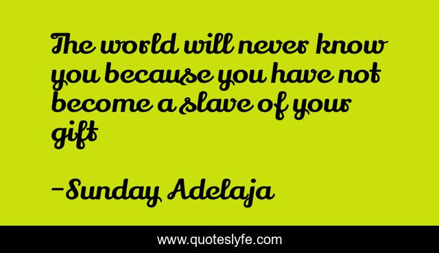 This page presents the quote "The world will never know you because you have not become a slave of your gift". Author of this quote is Sunday Adelaja. This quote is about life, slave, gift, slavery, calling, famous, purpose, truth, greatness,.