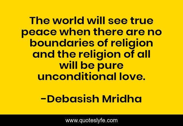 This page presents the quote "The world will see true peace when there are no boundaries of religion and the religion of all will be pure unconditional love.". Author of this quote is Debasish Mridha. This quote is about peace, inspirational, quotes, philosophy, debasish-mridha, religion, true-peace, debasish-mridha-md, unconditional-love,.