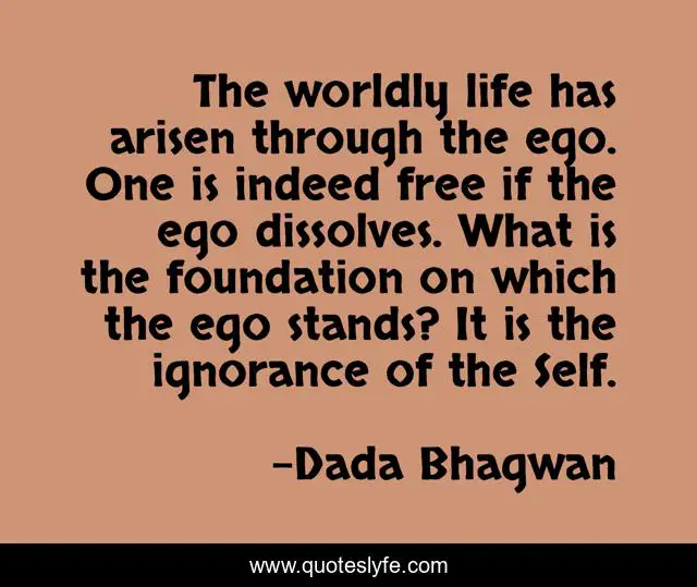 This page presents the quote "The worldly life has arisen through the ego. One is indeed free if the ego dissolves. What is the foundation on which the ego stands? It is the ignorance of the Self.". Author of this quote is Dada Bhagwan. This quote is about how-dissolved-our-ego, spiritual, how-ego-arise,.