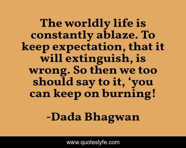 This page presents the quote "The worldly life is constantly ablaze. To keep expectation, that it will extinguish, is wrong. So then we too should say to it, ‘you can keep on burning!". Author of this quote is Dada Bhagwan. This quote is about spiritual, burning, expectation, wrong, world, extinguish,.