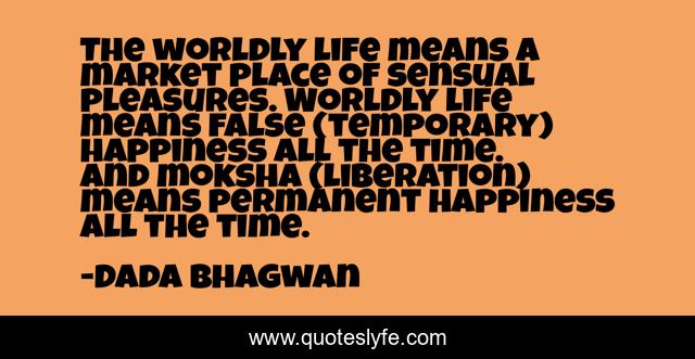 This page presents the quote "The worldly life means a market place of sensual pleasures. Worldly life means false (temporary) happiness all the time. And moksha (liberation) means permanent happiness all the time.". Author of this quote is Dada Bhagwan. This quote is about liberation, life, spiritual, happiness, moksha,.