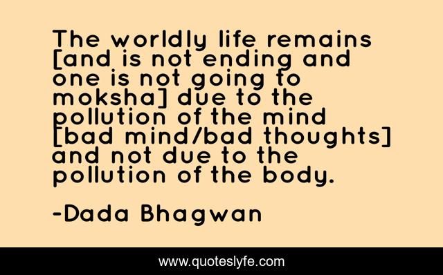 This page presents the quote "The worldly life remains [and is not ending and one is not going to moksha] due to the pollution of the mind [bad mind/bad thoughts] and not due to the pollution of the body.". Author of this quote is Dada Bhagwan. This quote is about body, life, moksha, mind, spiritual, world, thoughts, pollution,.