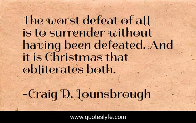 This page presents the quote "The worst defeat of all is to surrender without having been defeated. And it is Christmas that obliterates both.". Author of this quote is Craig D. Lounsbrough. This quote is about jesus-christ, faith, god, defeated, jesus, christianity, holidays, defeat, surrender,.