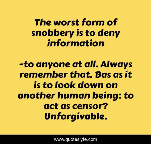 "to anyone at all. Always remember that. Bas as it is to look down on another human being: to act as censor? Unforgivable. Quotes." Quoteslyfe.com, 2025. Fri. 05 Dec. 2025. <https://www.quoteslyfe.com/quote/The-worst-form-of-snobbery-is-to-54888>.