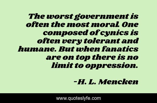This page presents the quote "The worst government is often the most moral. One composed of cynics is often very tolerant and humane. But when fanatics are on top there is no limit to oppression.". Author of this quote is H. L. Mencken. This quote is about moral, oppression, limit,.
