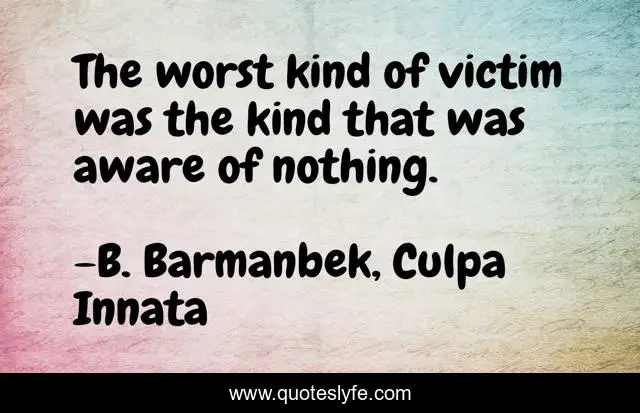 "B. Barmanbek, Culpa Innata Quotes." Quoteslyfe.com, 2025. Fri. 05 Dec. 2025. <https://www.quoteslyfe.com/quote/The-worst-kind-of-victim-was-the-110870>.