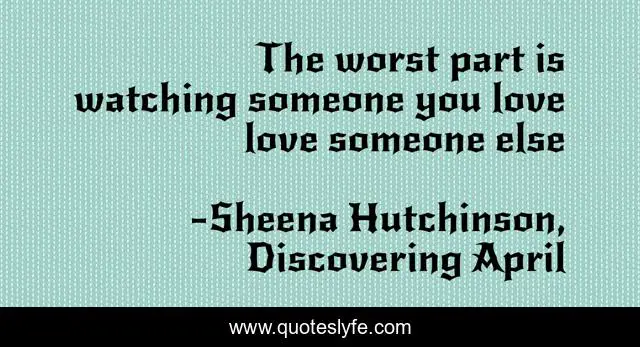 This page presents the quote "The worst part is watching someone you love love someone else". Author of this quote is Sheena Hutchinson, Discovering April. This quote is about love-hurts, love, affection, love-sadness-break-up,.