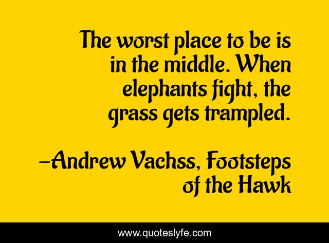 This page presents the quote "The worst place to be is in the middle. When elephants fight, the grass gets trampled.". Author of this quote is Andrew Vachss, Footsteps of the Hawk. .